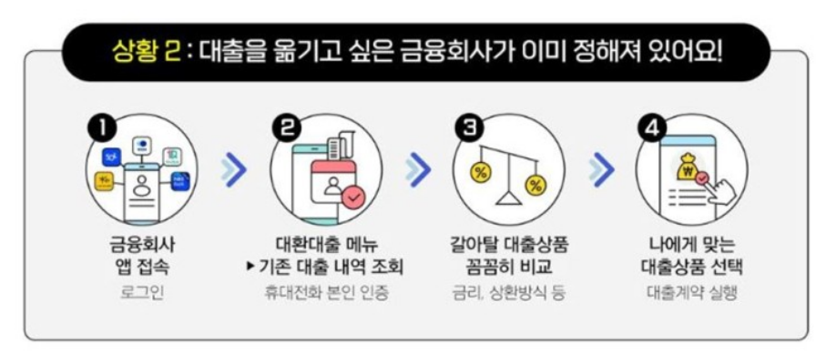 2) 대출을 옮기고 싶은 금융회사가 있다면 해당하는 금융회사 앱에 접속하여 대환대출 메뉴 선택 후 갈아탈 수 있는 대출상품을 비교해본 후 나에게 적합한 상품을 선택하시면 됩니다.
