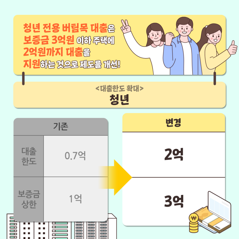 정부에서는 기존 버팀목 전세자금대출에 완화된 조건을 적용하고, 추가 지원을 더한 청년 전용 버팀목 전세자금대출을 운영하고 있습니다.