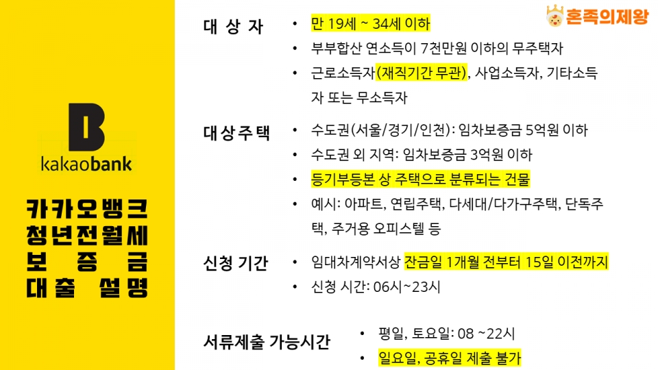카카오뱅크 전세자금대출는 온라인뱅킹이다보니, 모든 처리를 온라인으로 완료 할 수 있다는 장점이 있어요. 그리고 조건도 연소득 7000만원 이하로 좀 완화되어 있으며, 직업 조건이 없어 무직자도 신청가능 합니다.