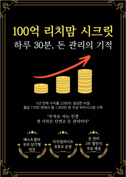 요즘 많은 사람들이 경제적 자유를 꿈꾼다. 나 또한 이보다는 소박하지만, 현재보다 더 나은 경제적 여유를 꿈꾼다. 이를 위해서 돈 공부를 시작하였다. 그러면서 자연스레 학교 선생님을 하다가 경제적 자유를 얻으신 [리치맘]을 알게 되었다. 그리고 감사하게도 [100억 리치맘 시크릿편, 하루 30분 돈관리 기적]이라는 전자책을 무료 이벤트를 통해 받아서 읽어보게 되었다.