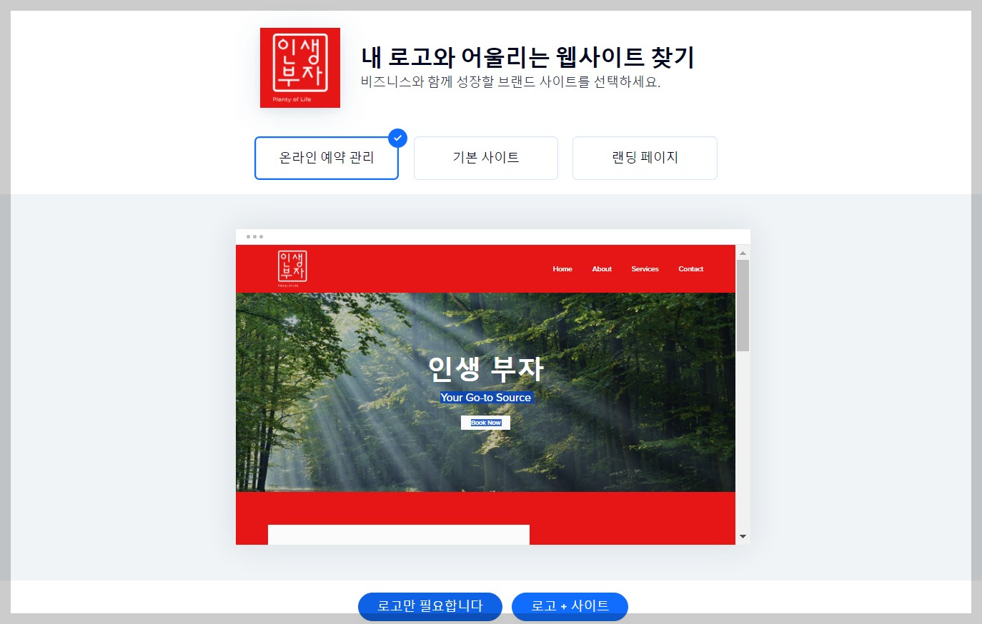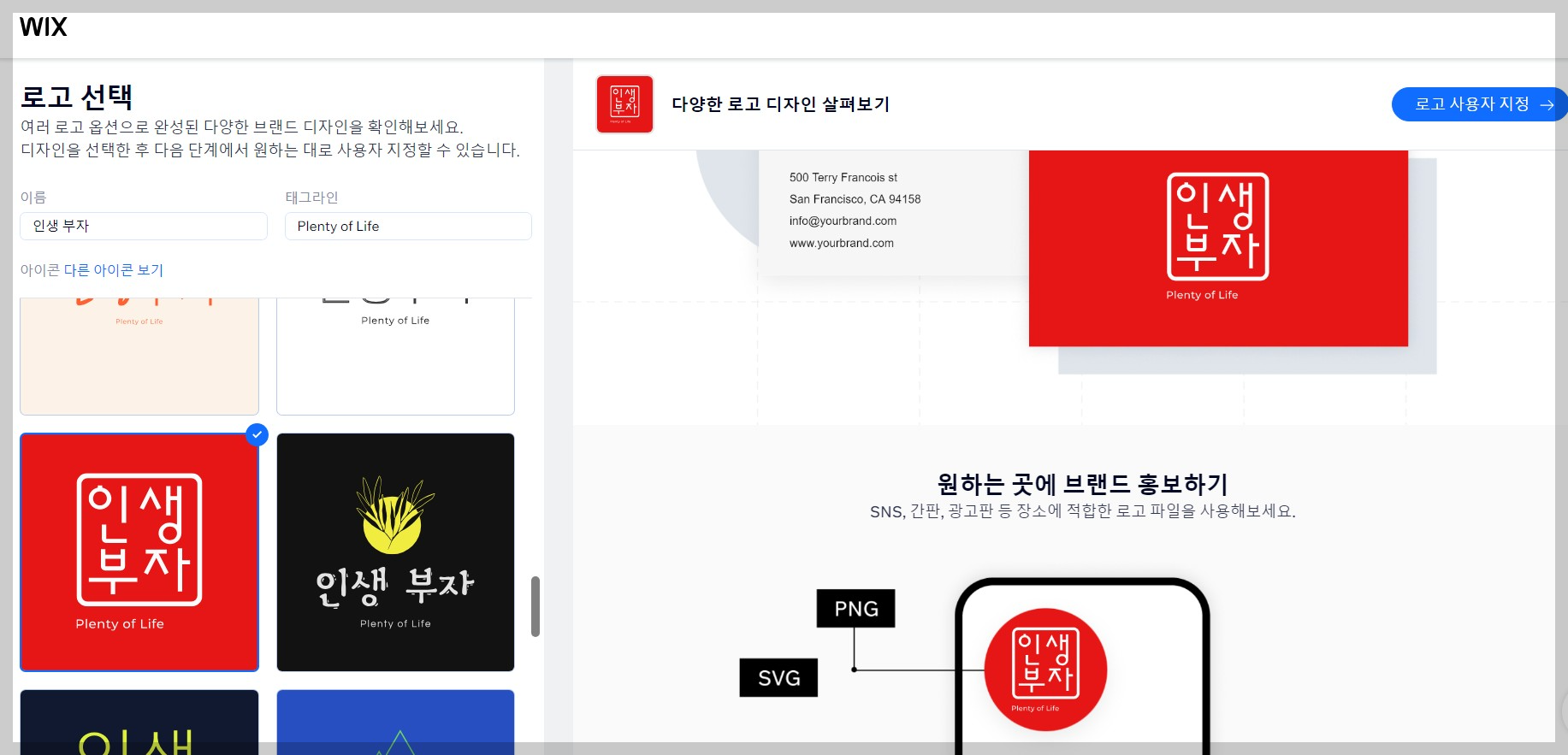 자동으로 생성된 로고 중에 마음에 드는 것을 선택하면 우측 화면에서 로고 디자인을 상세하게 살펴볼 수 있습니다.