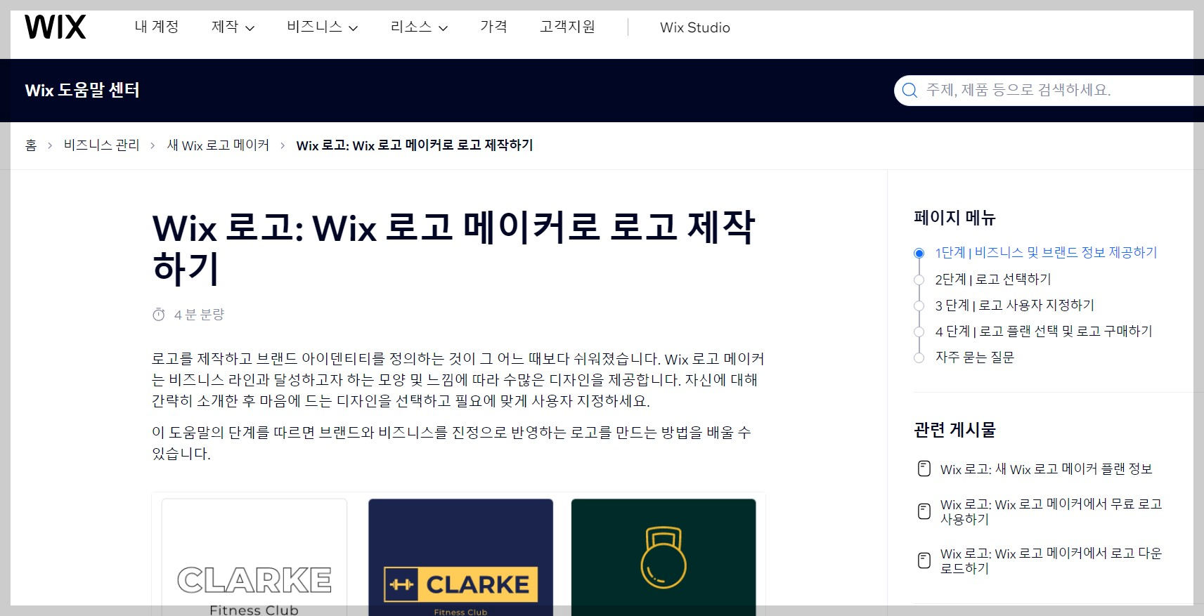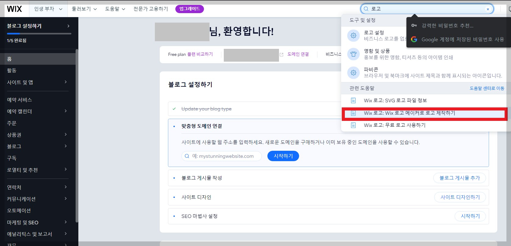 3. Wix 검색창에 '로고' 라고 입력 후 'Wix 로고 메이커로 로고 제작하기' 클릭